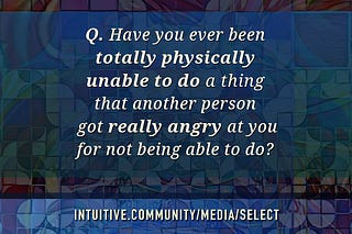 Q. Have you ever been totally physically unable to do a thing that another person got really angry at you for not being able to do?