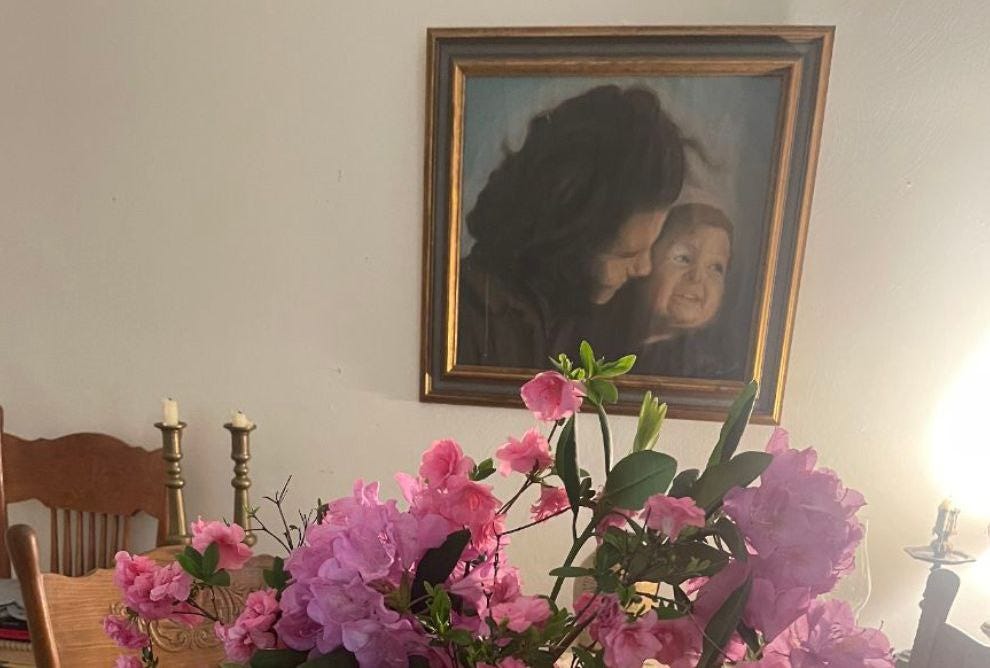 "Grandma Elizabeth holding my uncle as a baby; chalk on sandpaper by her daughter, my mother, Elizabeth Ann DeChant. My mother made this art piece with chalk on sandpaper in 1968 when she was 23 in graduate school, based on a photograph she had taken in 1955 at age 12 of her mother and her brother Joey in a boat at Mosquito Lake when her brother was about 6 months old. She gave the chalk drawing as a gift to her parents on their wedding anniversary, and now it's framed on the wall in our living room." — Megan Elizabeth Morris on 30 April 2025, after sundown, which began Grandma Elizabeth's Mayan Tzolkin birthday (Star 7 Jaguar) • More: t.me/IntuitiveGallery/447